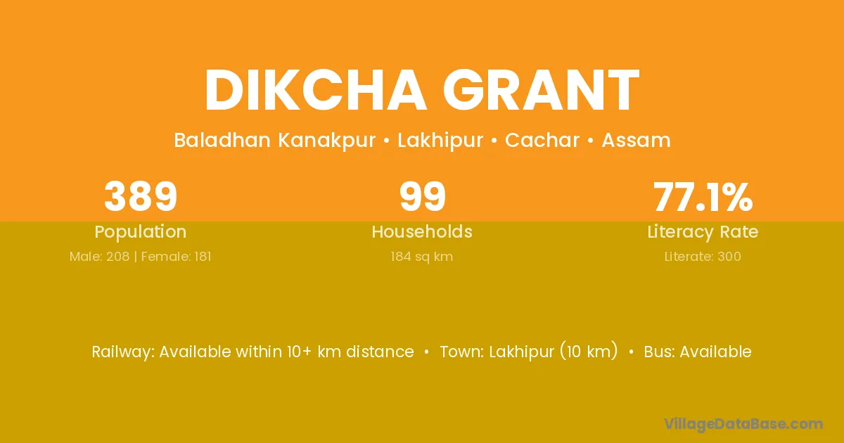 Lakhipur (10 km) is the nearest town to Dikcha Grant village for major economic activities and is located approximately 10 km away.