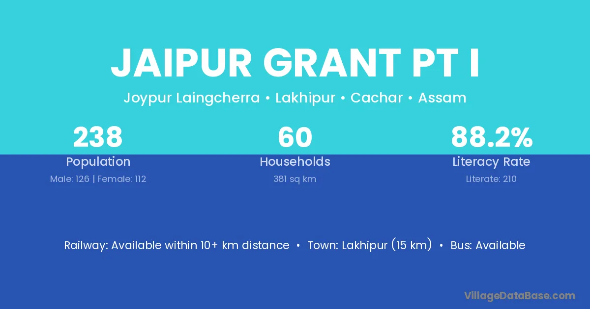 Lakhipur (15 km) is the nearest town to Jaipur Grant Pt I village for major economic activities and is located approximately 15 km away.