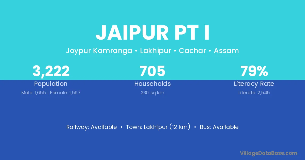 Lakhipur (12 km) is the nearest town to Jaipur Pt I village for major economic activities and is located approximately 12 km away.