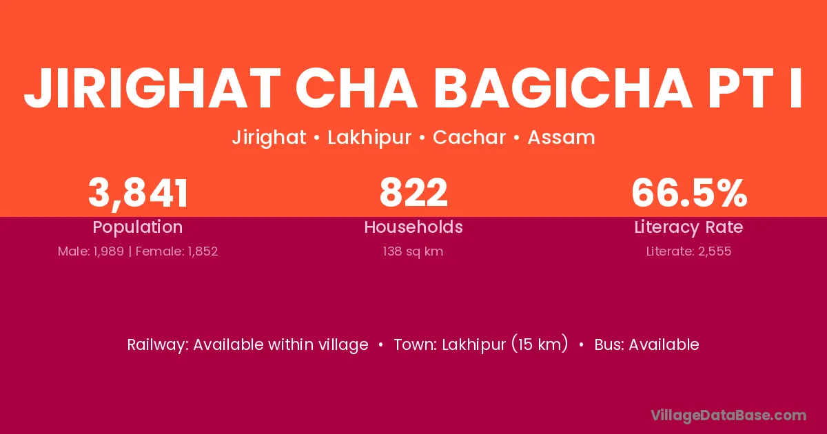 Jirighat Cha Bagicha Pt I village has a total population of 3,841 people, of which 1,989 are males and 1,852 are females.