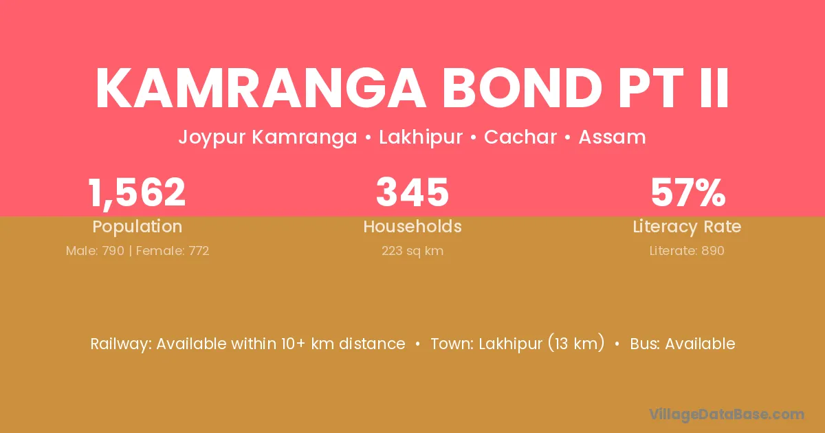 Lakhipur (13 km) is the nearest town to Kamranga Bond Pt Ii village for major economic activities and is located approximately 13 km away.