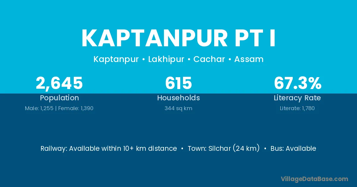 Silchar (24 km) is the nearest town to Kaptanpur Pt I village for major economic activities and is located approximately 24 km away.