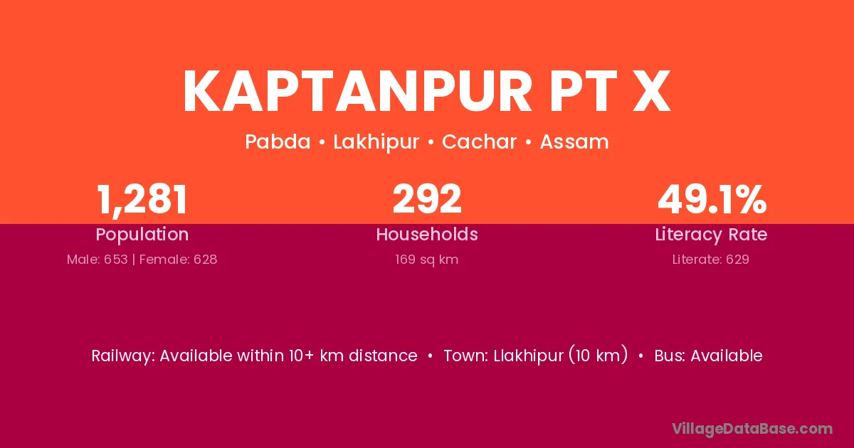 Llakhipur (10 km) is the nearest town to Kaptanpur Pt X village for major economic activities and is located approximately 10 km away.