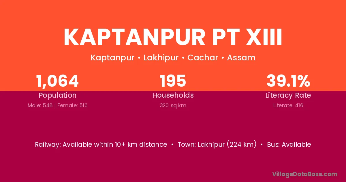 Lakhipur (224 km) is the nearest town to Kaptanpur Pt Xiii village for major economic activities and is located approximately 224 km away.
