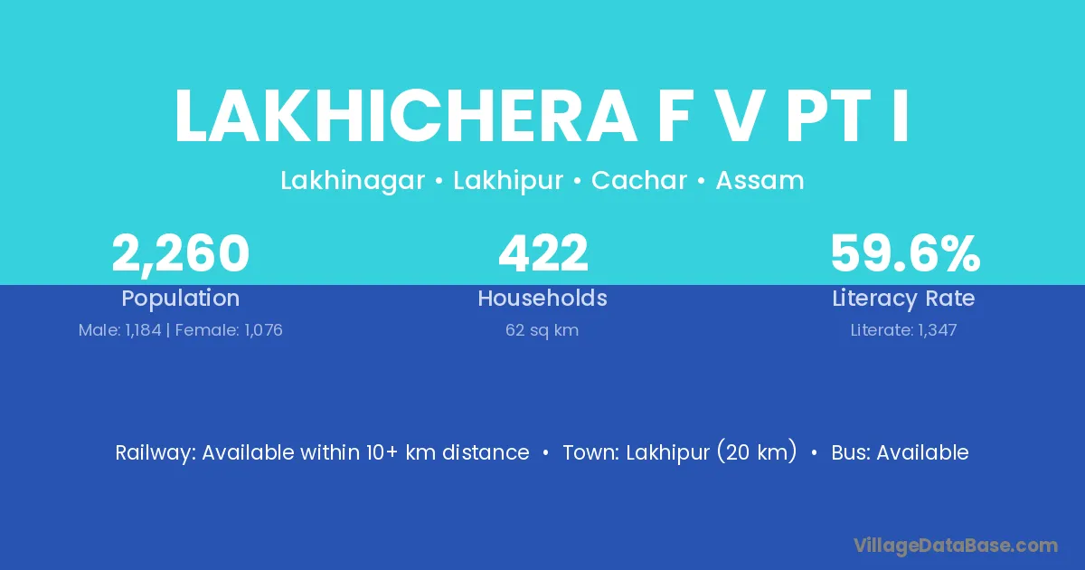 Lakhipur (20 km) is the nearest town to Lakhichera F V Pt I village for major economic activities and is located approximately 20 km away.