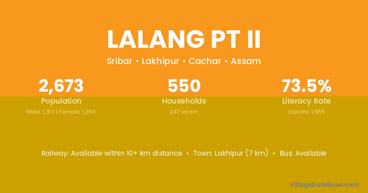 Lakhipur (7 km) is the nearest town to Lalang Pt Ii village for major economic activities and is located approximately 7 km away.