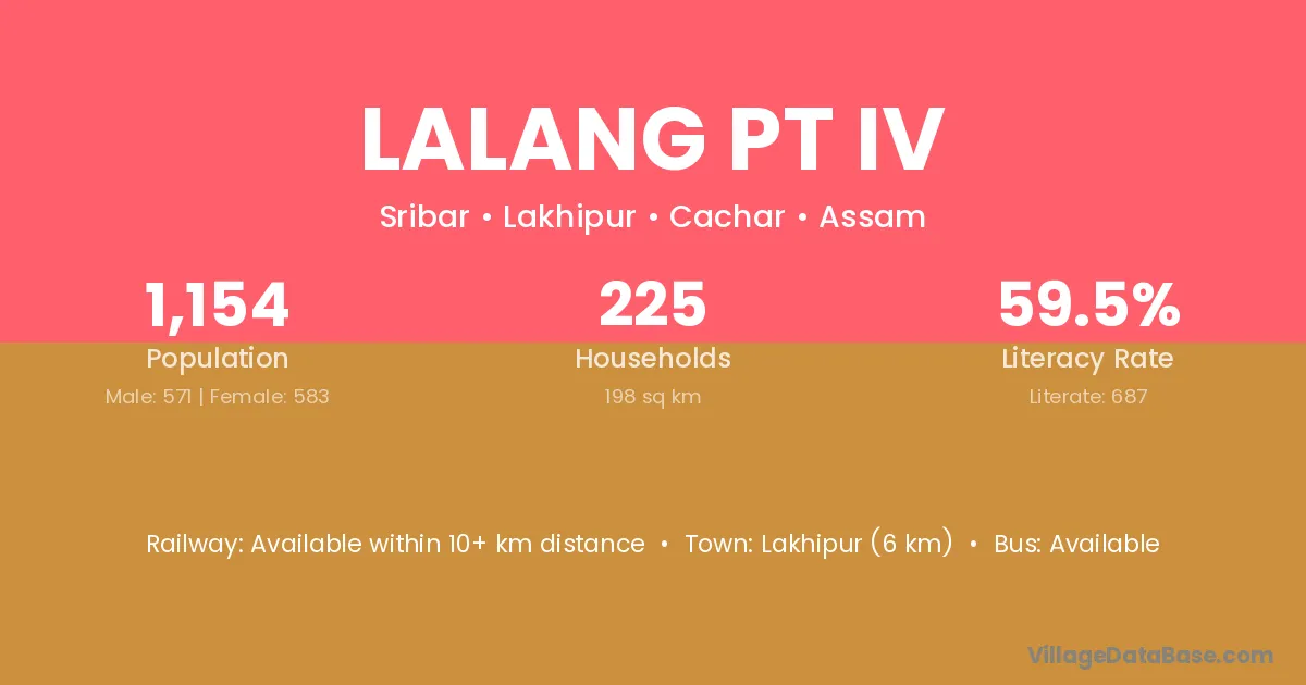 Lakhipur (6 km) is the nearest town to Lalang Pt Iv village for major economic activities and is located approximately 6 km away.