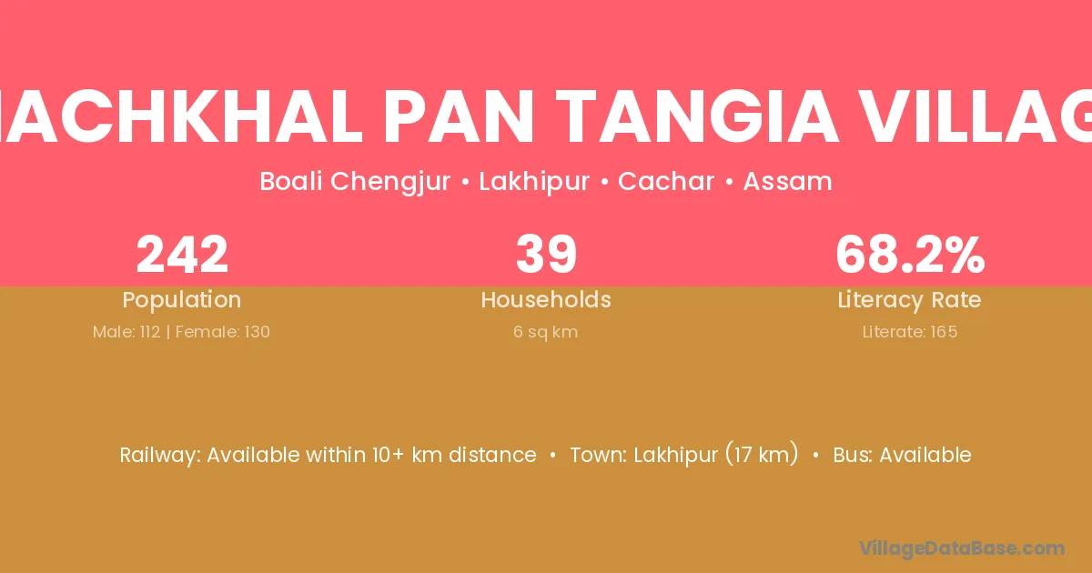 Lakhipur (17 km) is the nearest town to Machkhal Pan Tangia Village village for major economic activities and is located approximately 17 km away.