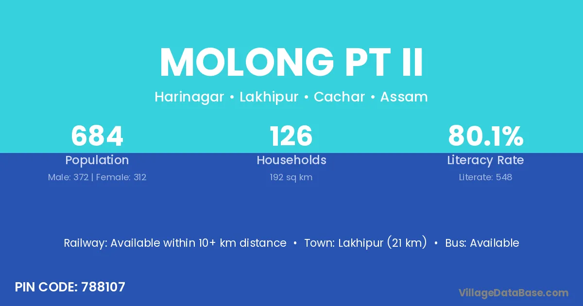 Lakhipur (21 km) is the nearest town to Molong Pt Ii village for major economic activities and is located approximately 21 km away.