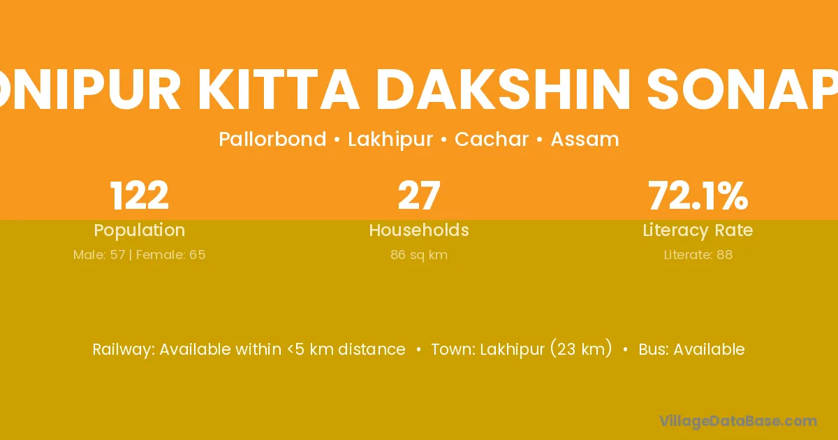 Monipur Kitta Dakshin Sonapur village has a total population of 122 people, of which 57 are males and 65 are females.
