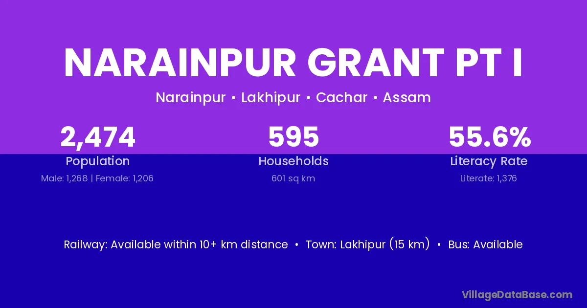 Lakhipur (15 km) is the nearest town to Narainpur Grant Pt I village for major economic activities and is located approximately 15 km away.