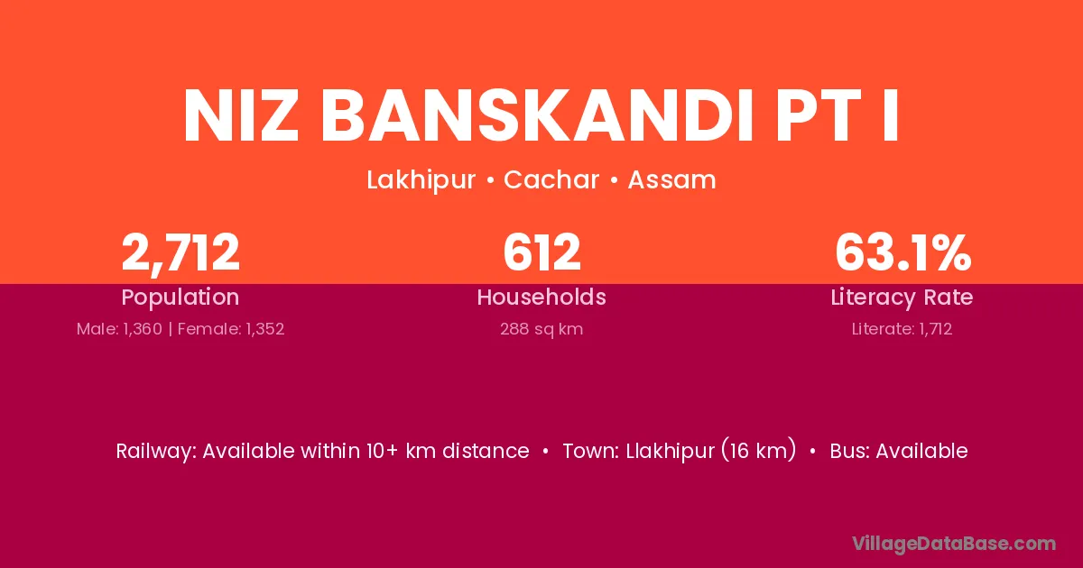 Llakhipur (16 km) is the nearest town to Niz Banskandi Pt I village for major economic activities and is located approximately 16 km away.