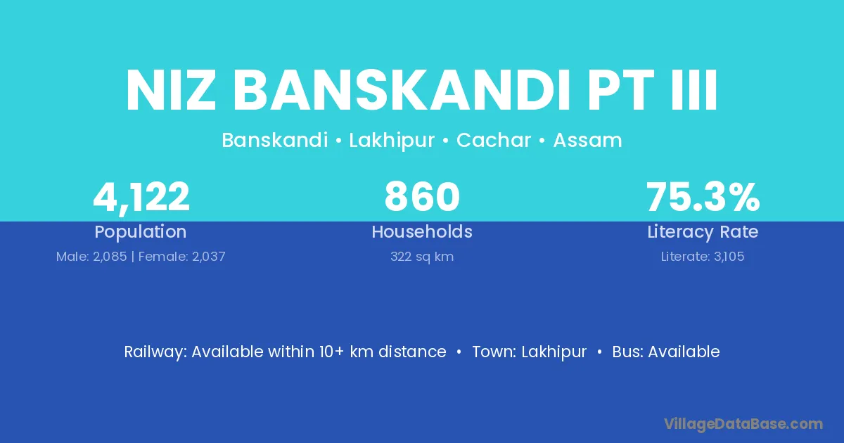 Niz Banskandi Pt Iii village has a total population of 4,122 people, of which 2,085 are males and 2,037 are females.