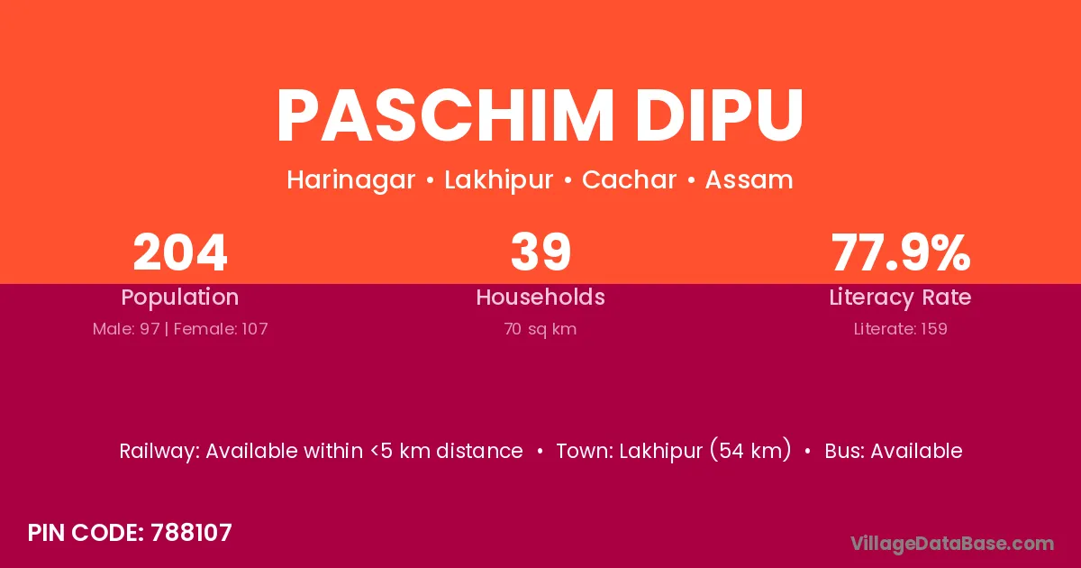Paschim Dipu village has a total population of 204 people, of which 97 are males and 107 are females.