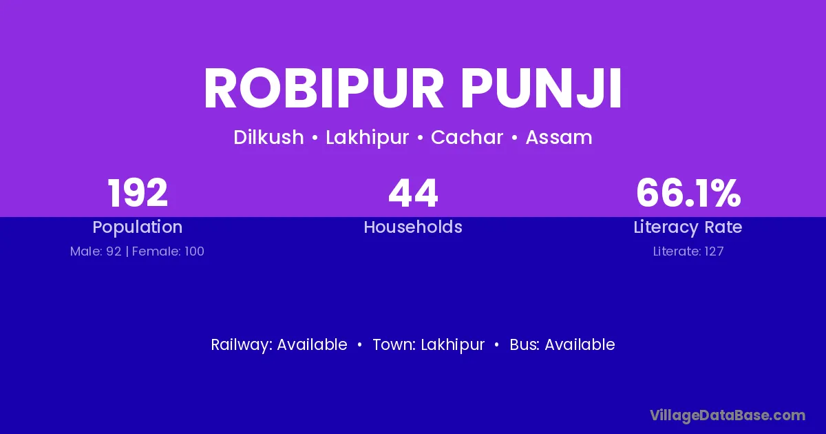 Robipur Punji village has a total population of 192 people, of which 92 are males and 100 are females.