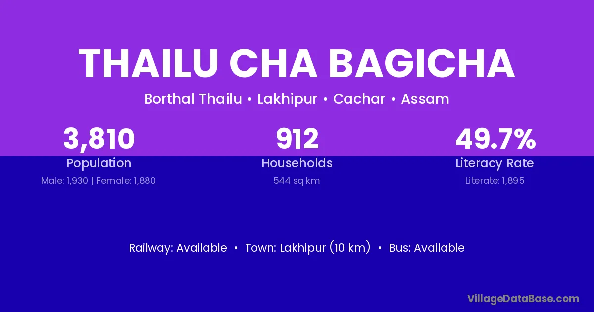 Lakhipur (10 km) is the nearest town to Thailu Cha Bagicha village for major economic activities and is located approximately 10 km away.