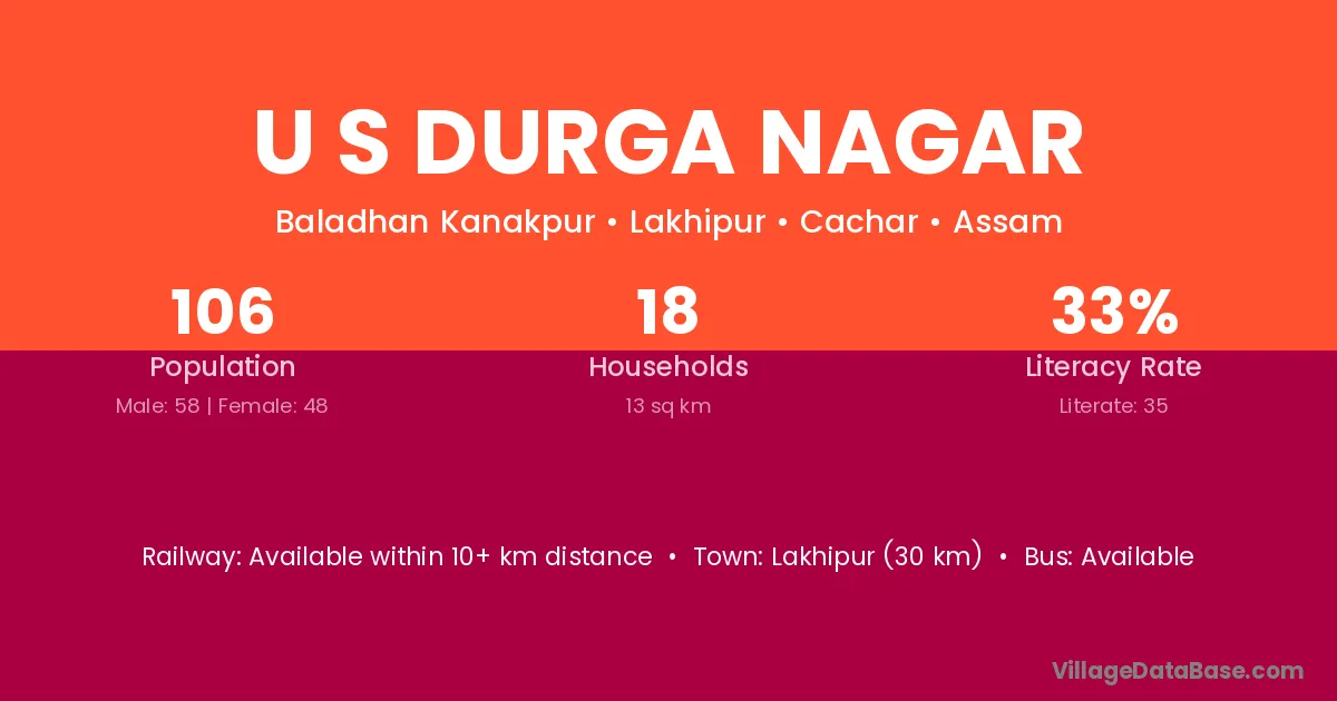 U S Durga Nagar village has a total population of 106 people, of which 58 are males and 48 are females.