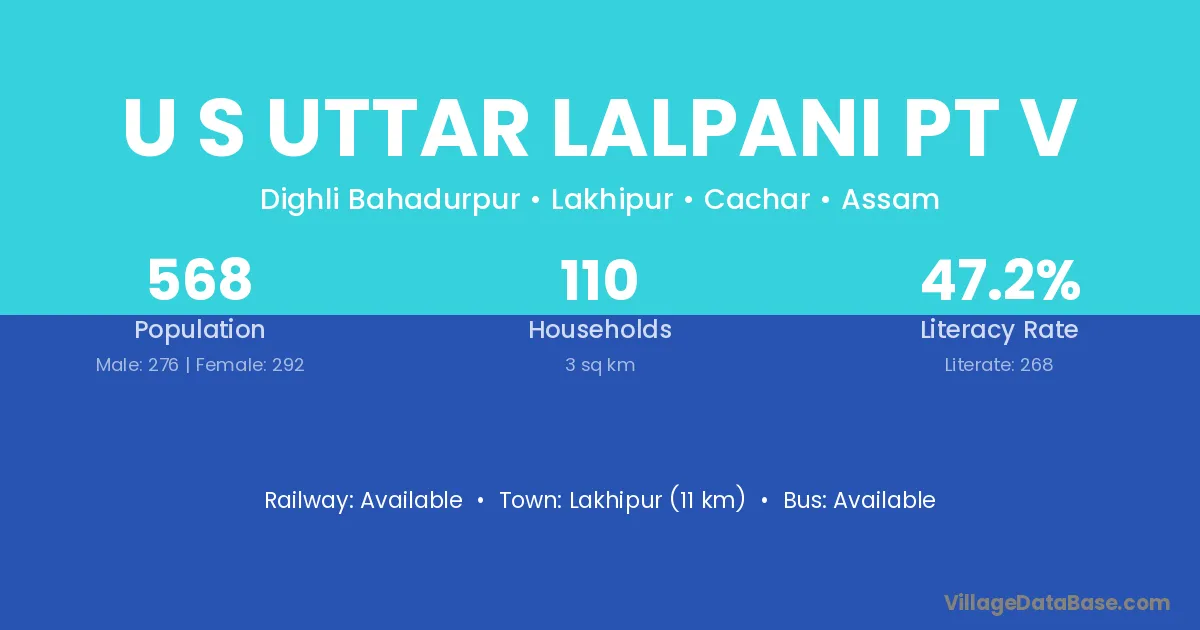 Lakhipur (11 km) is the nearest town to U S Uttar Lalpani Pt V village for major economic activities and is located approximately 11 km away.