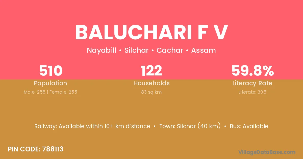 Silchar (40 km) is the nearest town to Baluchari F V village for major economic activities and is located approximately 40 km away.