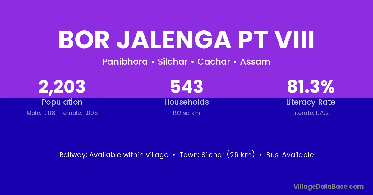 Silchar (26 km) is the nearest town to Bor Jalenga Pt Viii village for major economic activities and is located approximately 26 km away.