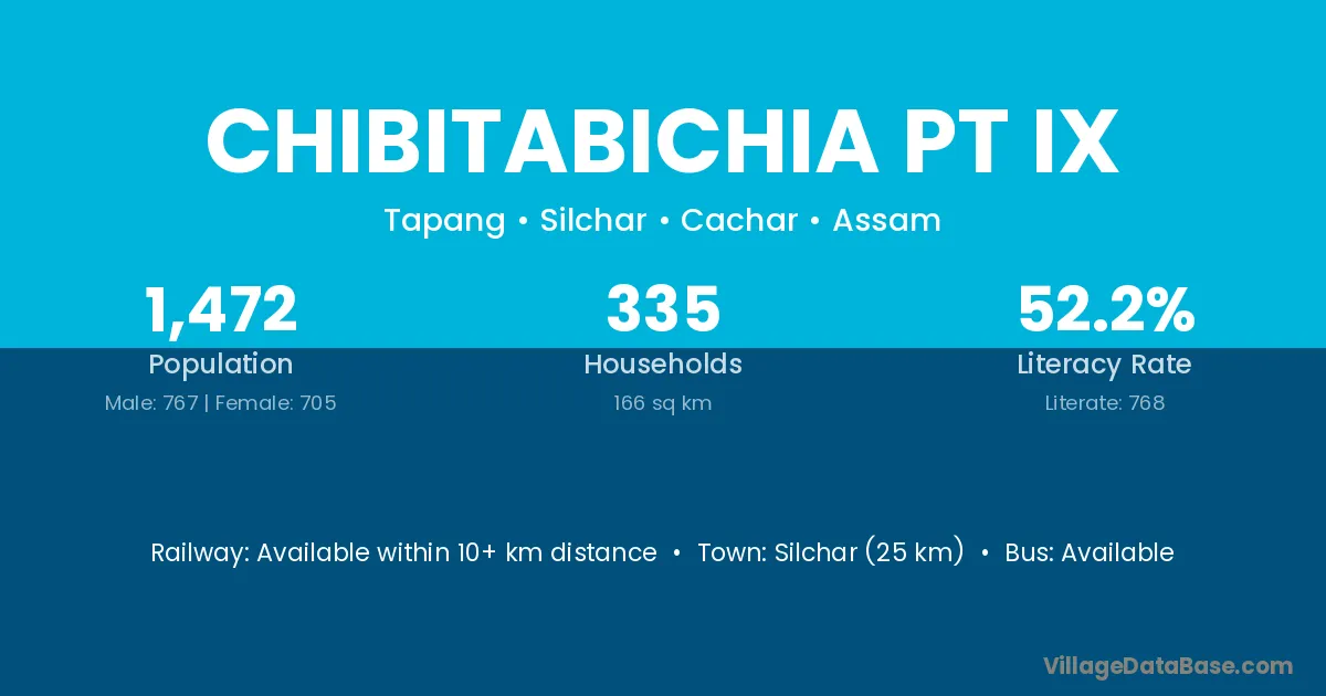 Silchar (25 km) is the nearest town to Chibitabichia Pt Ix village for major economic activities and is located approximately 25 km away.