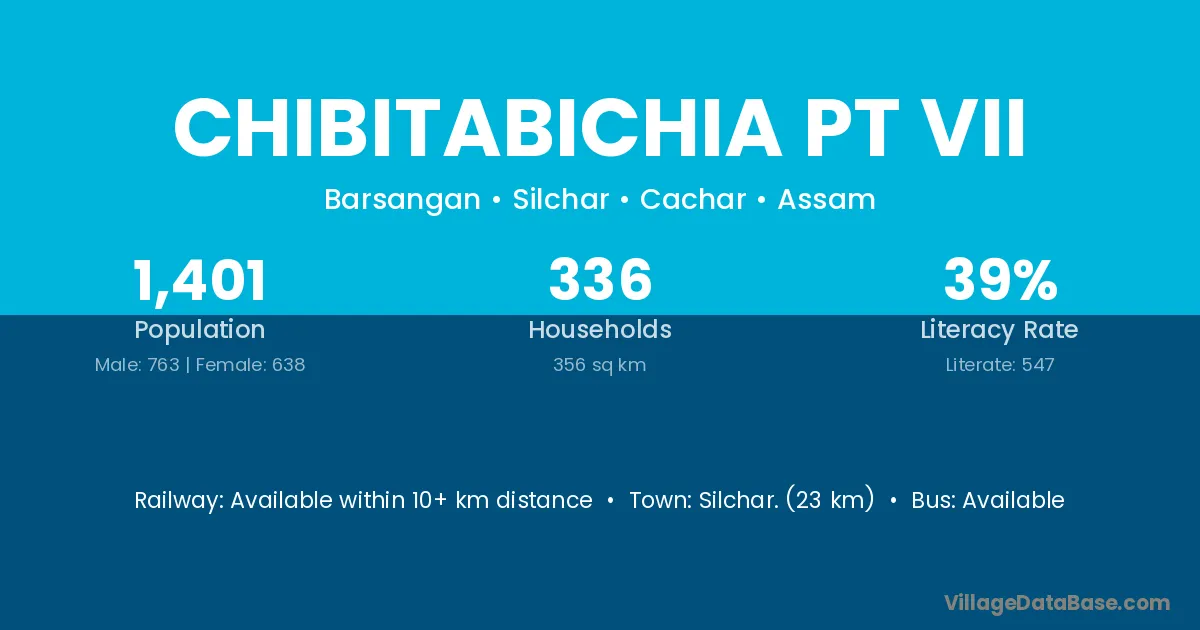 Silchar. (23 km) is the nearest town to Chibitabichia Pt Vii village for major economic activities and is located approximately 23 km away.