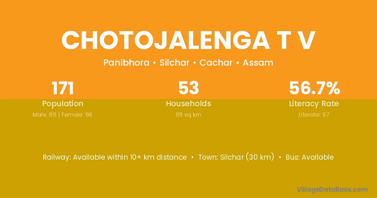 Silchar (30 km) is the nearest town to Chotojalenga T V village for major economic activities and is located approximately 30 km away.
