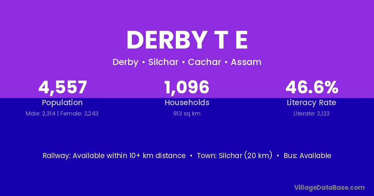 Silchar (20 km) is the nearest town to Derby T E village for major economic activities and is located approximately 20 km away.