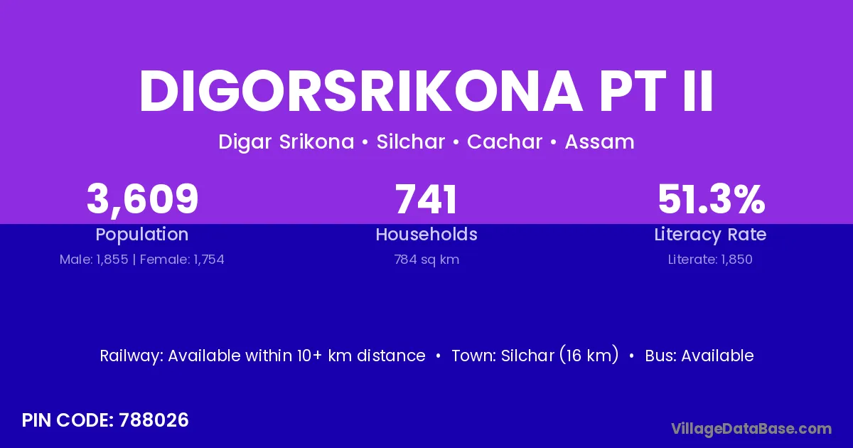 Silchar (16 km) is the nearest town to Digorsrikona Pt Ii village for major economic activities and is located approximately 16 km away.
