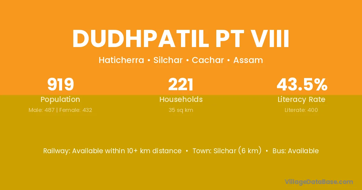 Silchar (6 km) is the nearest town to Dudhpatil Pt Viii village for major economic activities and is located approximately 6 km away.