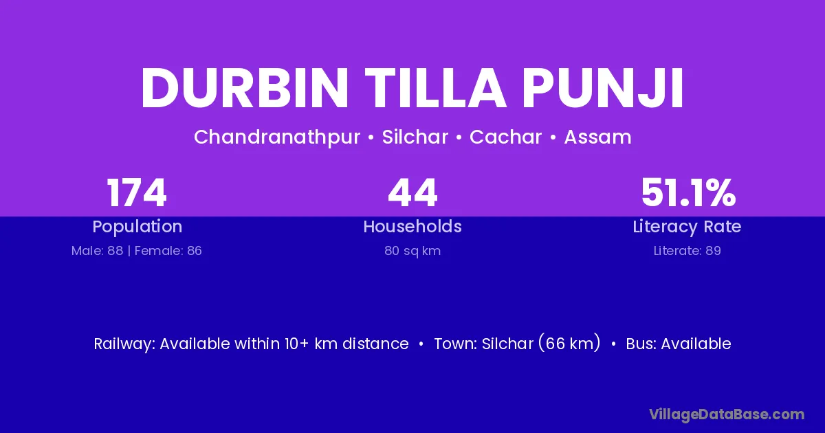 Silchar (66 km) is the nearest town to Durbin Tilla Punji village for major economic activities and is located approximately 66 km away.