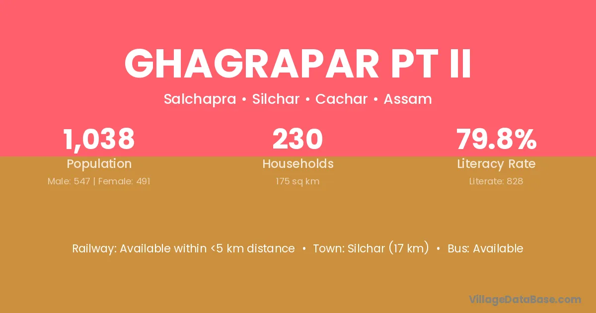 Silchar (17 km) is the nearest town to Ghagrapar Pt Ii village for major economic activities and is located approximately 17 km away.