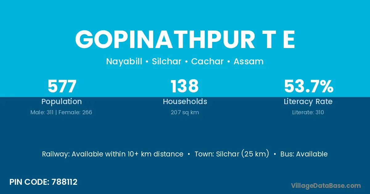Silchar (25 km) is the nearest town to Gopinathpur T E village for major economic activities and is located approximately 25 km away.