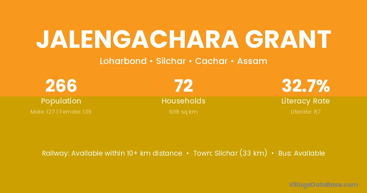 Silchar (33 km) is the nearest town to Jalengachara Grant village for major economic activities and is located approximately 33 km away.