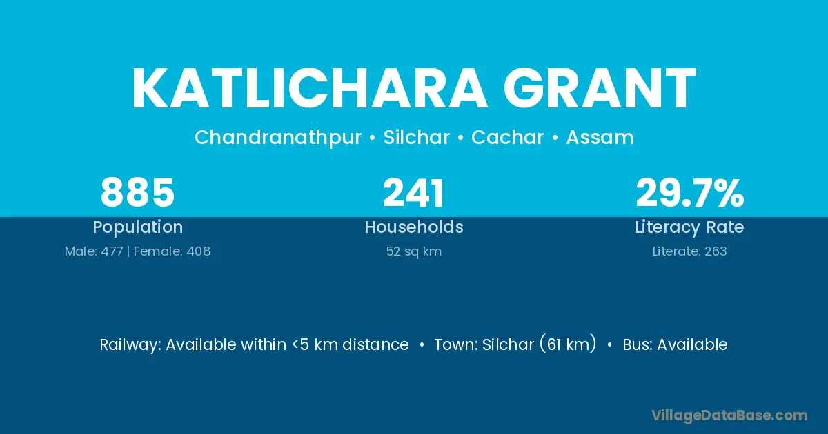 Silchar (61 km) is the nearest town to Katlichara Grant village for major economic activities and is located approximately 61 km away.