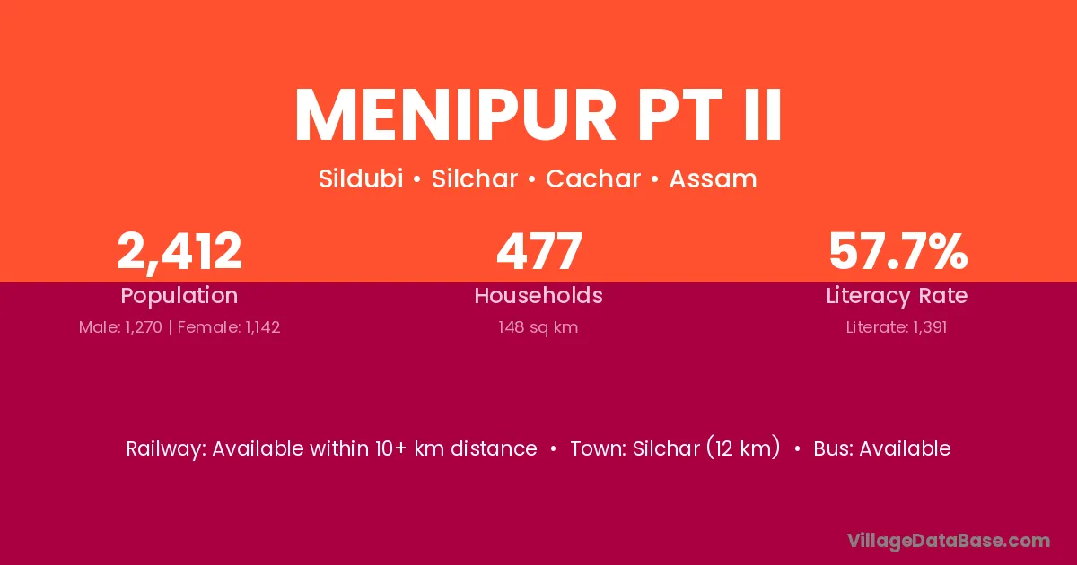 Silchar (12 km) is the nearest town to Menipur Pt Ii village for major economic activities and is located approximately 12 km away.