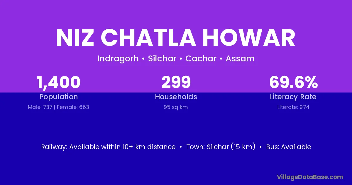Silchar (15 km) is the nearest town to Niz Chatla Howar village for major economic activities and is located approximately 15 km away.