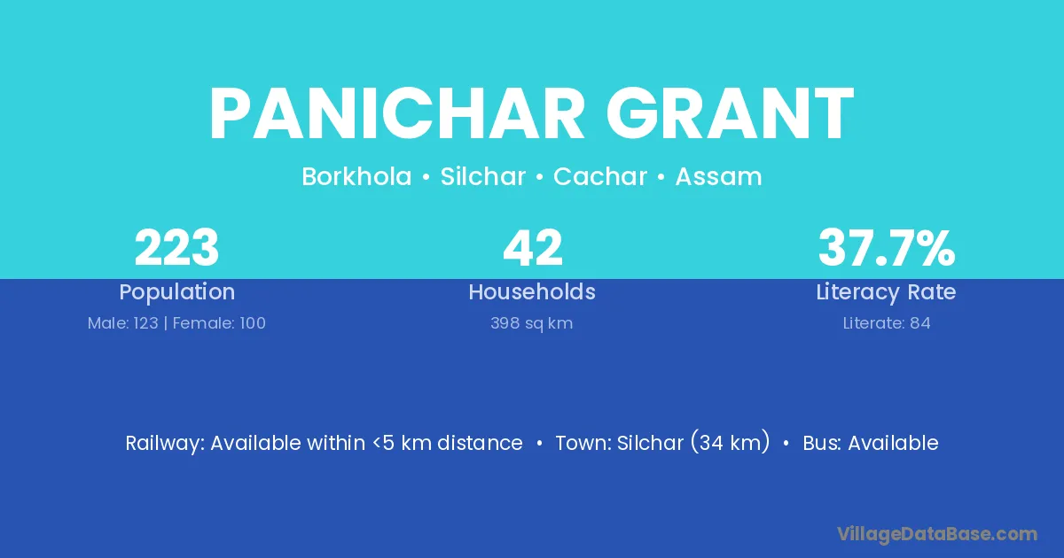 Silchar (34 km) is the nearest town to Panichar Grant village for major economic activities and is located approximately 34 km away.