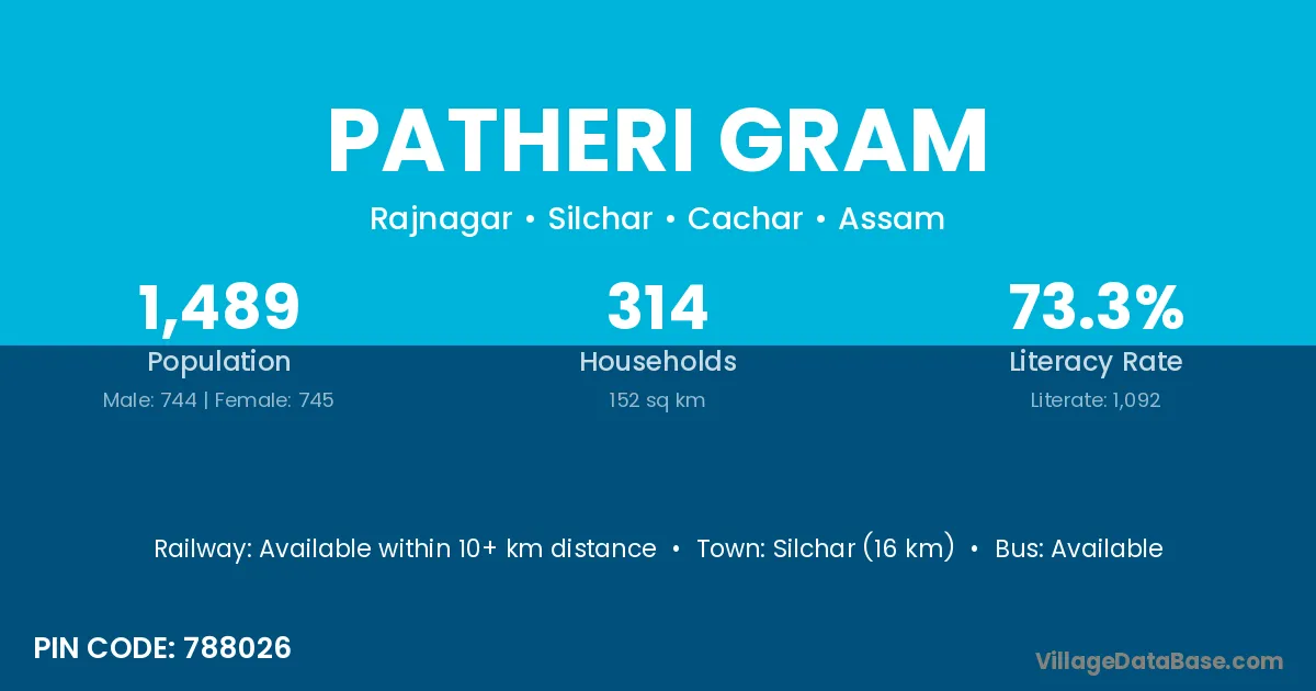 Silchar (16 km) is the nearest town to Patheri Gram village for major economic activities and is located approximately 16 km away.