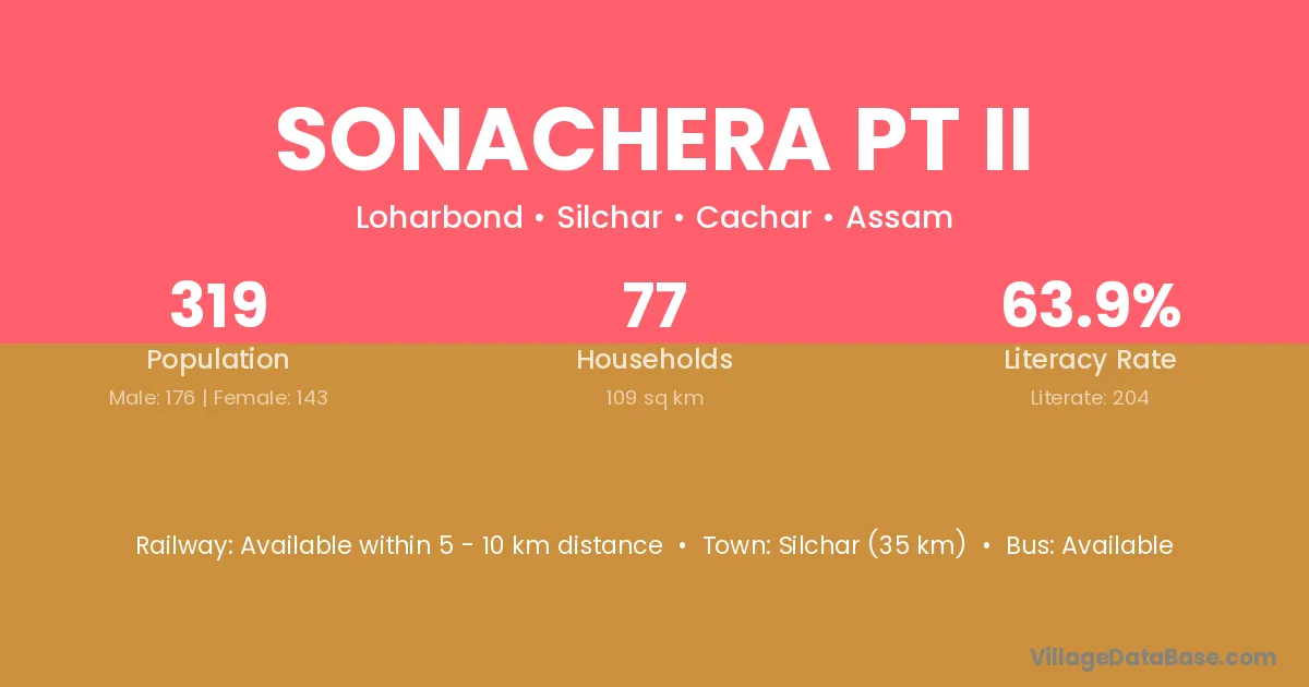 Silchar (35 km) is the nearest town to Sonachera Pt Ii village for major economic activities and is located approximately 35 km away.