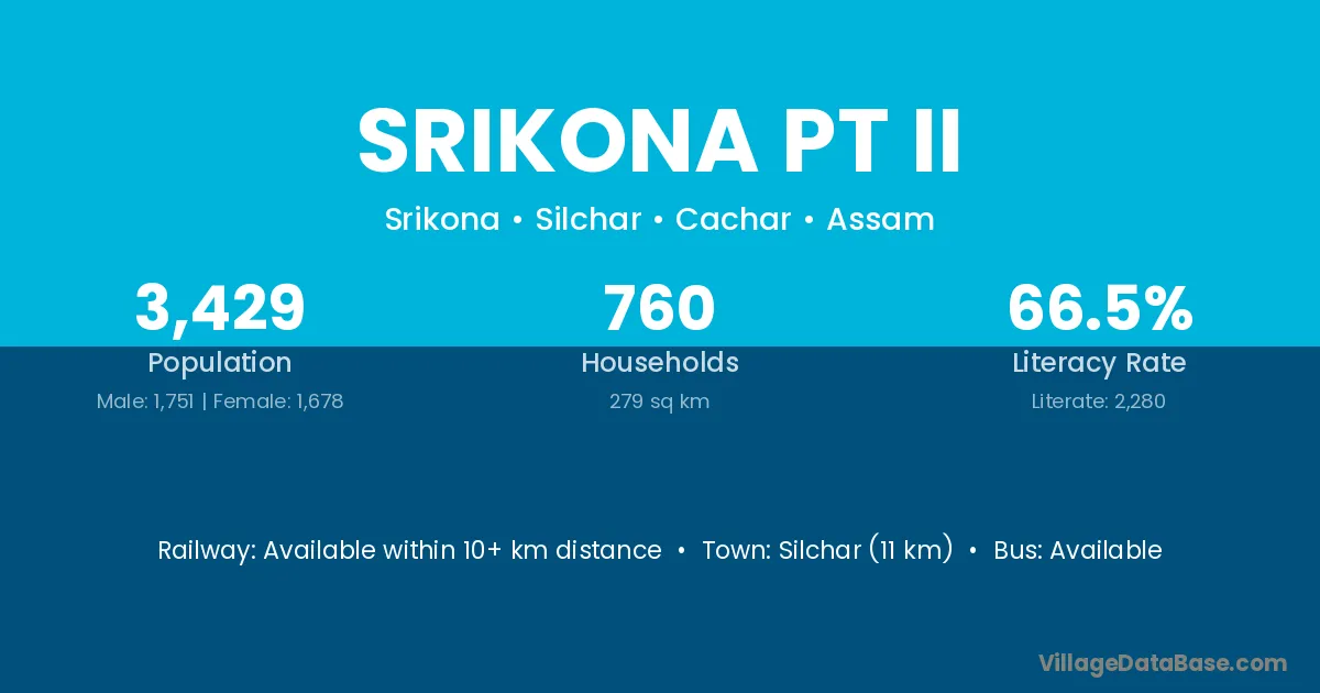 Silchar (11 km) is the nearest town to Srikona Pt Ii village for major economic activities and is located approximately 11 km away.