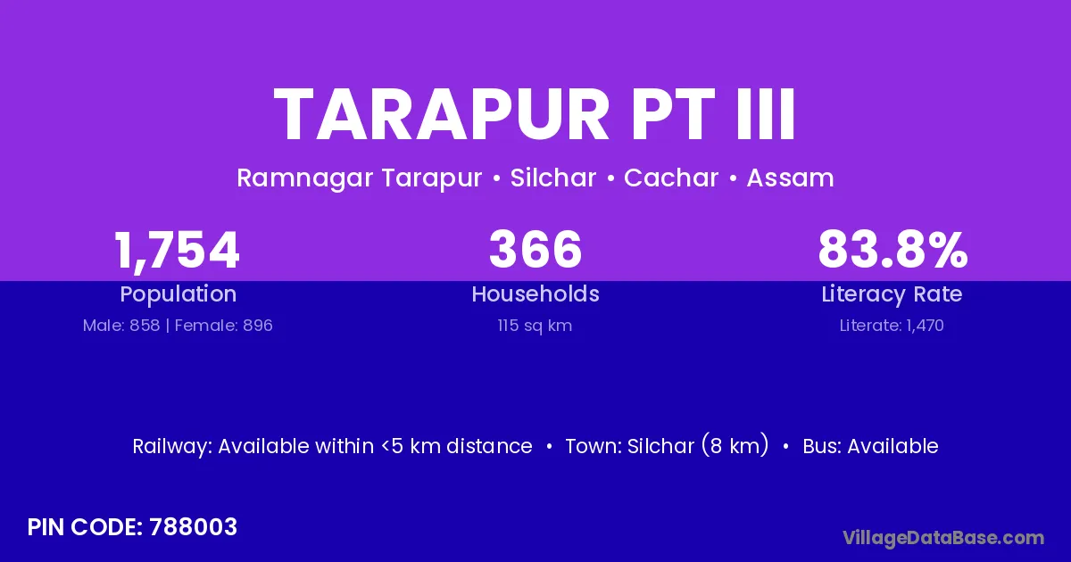 Silchar (8 km) is the nearest town to Tarapur Pt Iii village for major economic activities and is located approximately 8 km away.