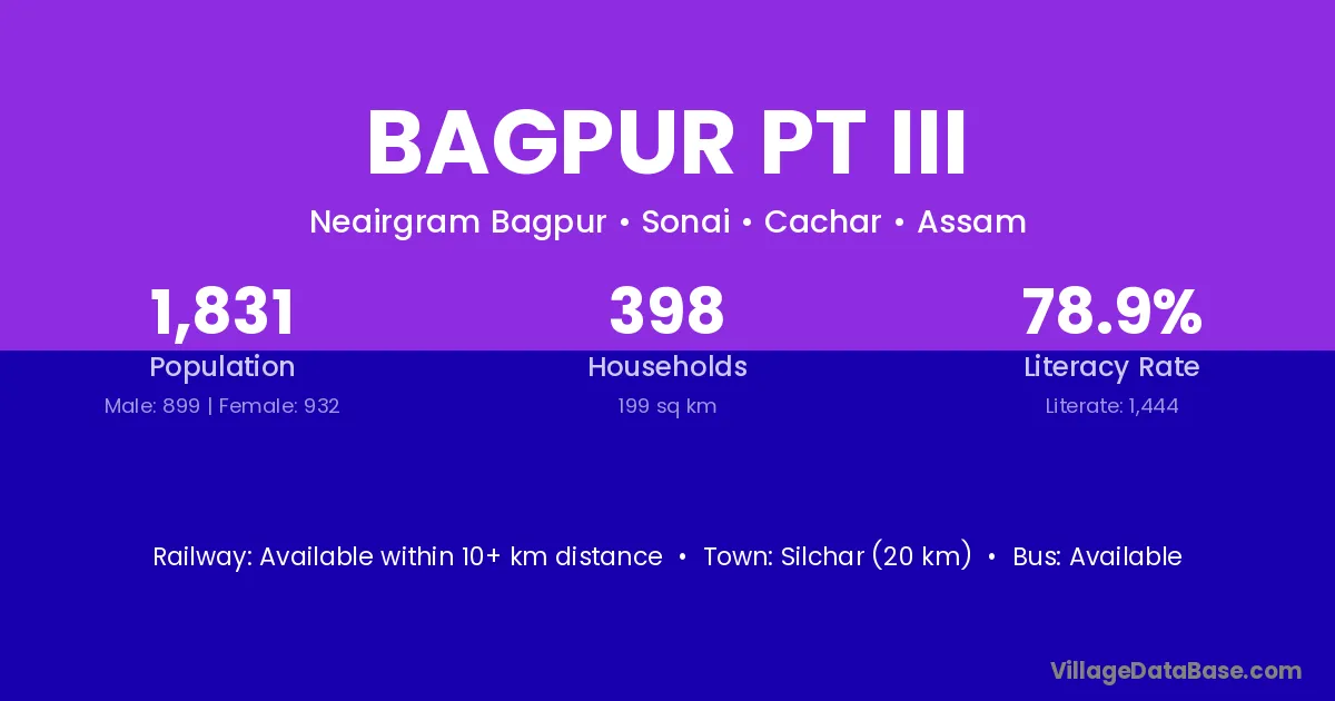 Silchar (20 km) is the nearest town to Bagpur Pt Iii village for major economic activities and is located approximately 20 km away.