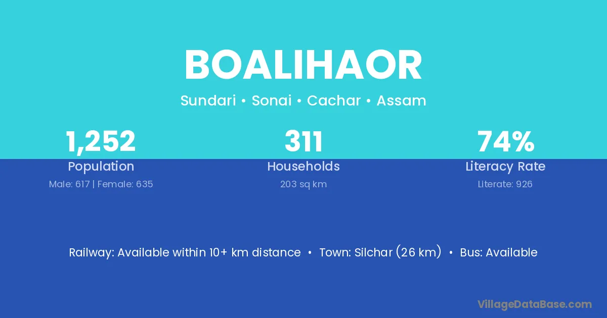 Silchar (26 km) is the nearest town to Boalihaor village for major economic activities and is located approximately 26 km away.