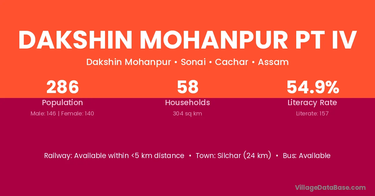 Silchar (24 km) is the nearest town to Dakshin Mohanpur Pt Iv village for major economic activities and is located approximately 24 km away.