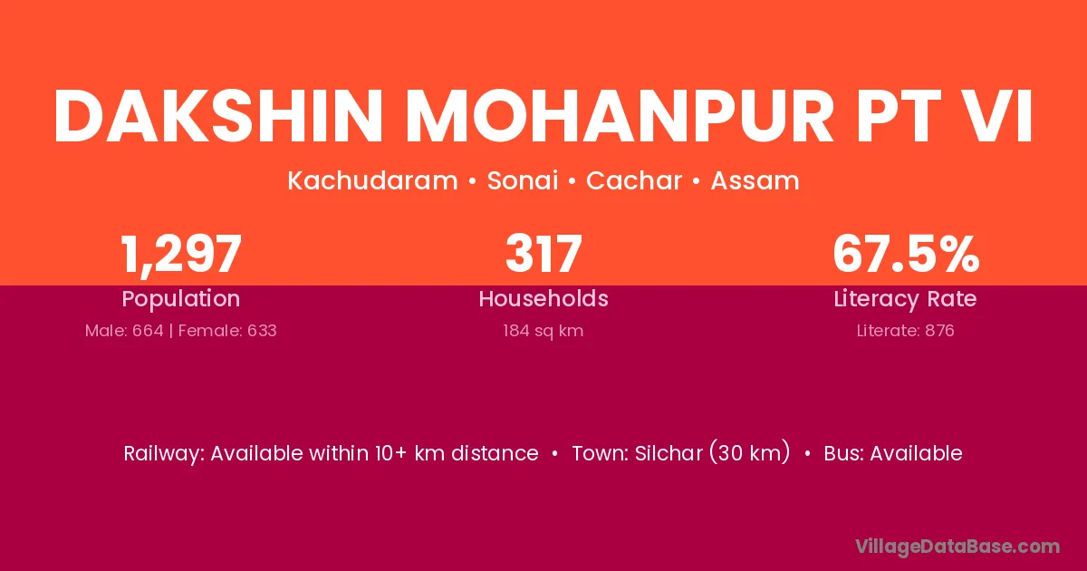 Silchar (30 km) is the nearest town to Dakshin Mohanpur Pt Vi village for major economic activities and is located approximately 30 km away.