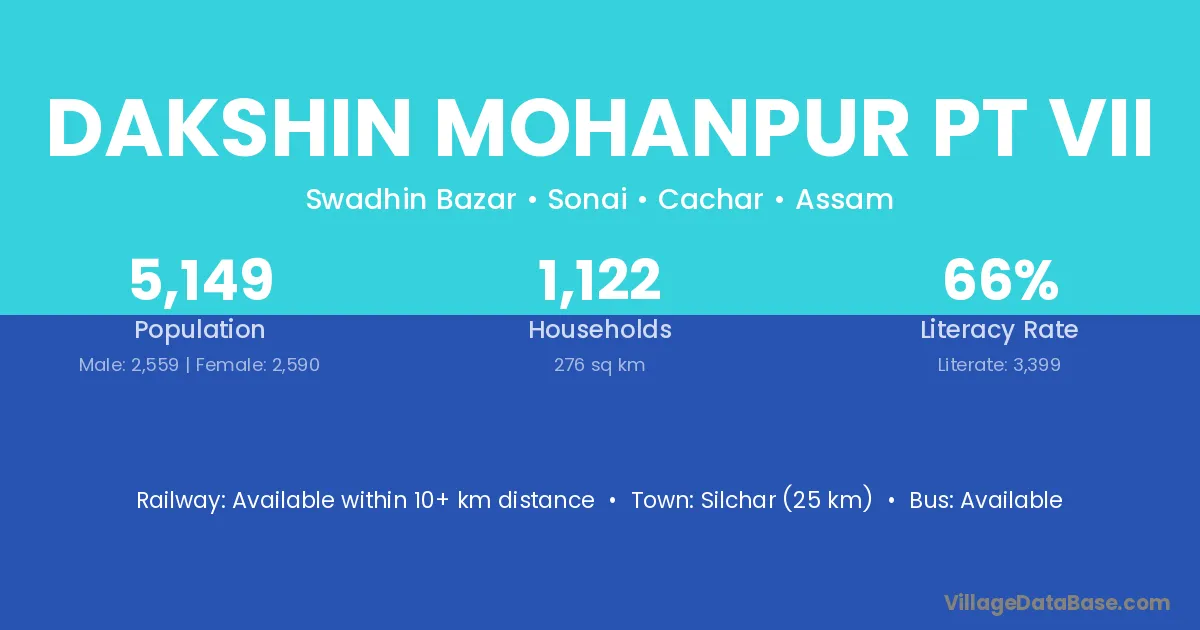 Silchar (25 km) is the nearest town to Dakshin Mohanpur Pt Vii village for major economic activities and is located approximately 25 km away.