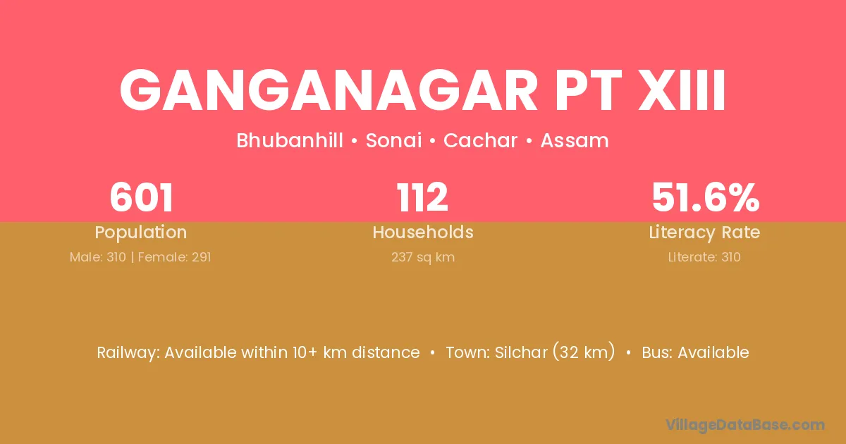 Silchar (32 km) is the nearest town to Ganganagar Pt Xiii village for major economic activities and is located approximately 32 km away.