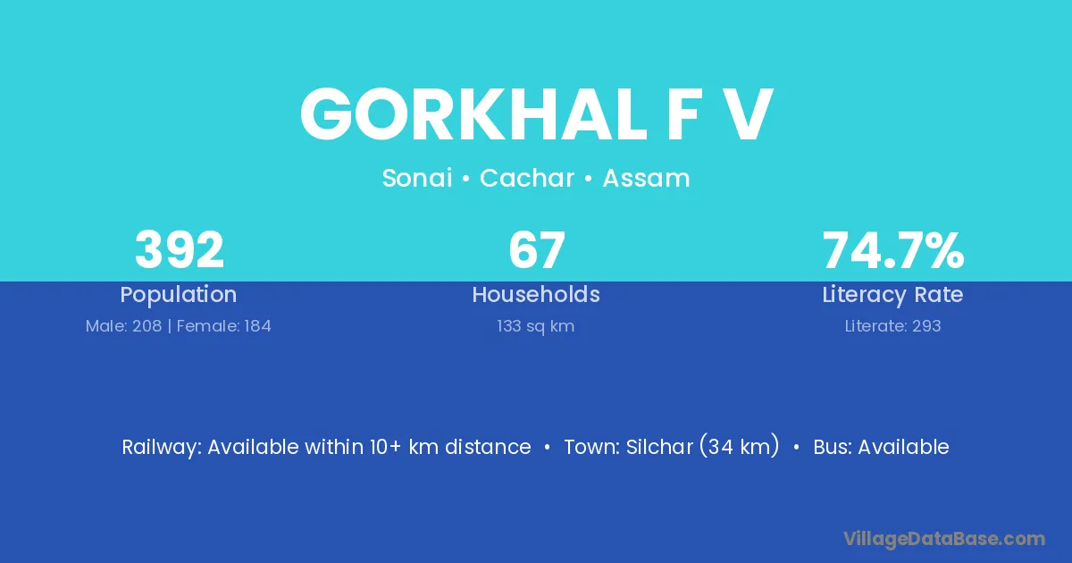 Silchar (34 km) is the nearest town to Gorkhal F V village for major economic activities and is located approximately 34 km away.