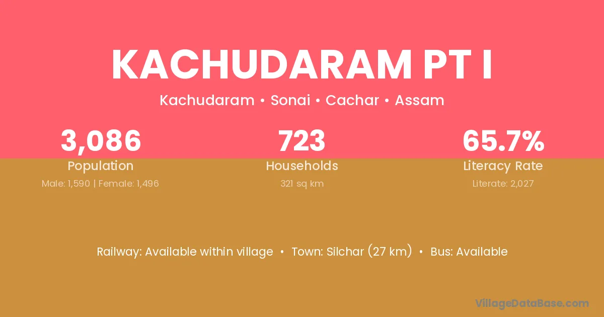 Silchar (27 km) is the nearest town to Kachudaram Pt I village for major economic activities and is located approximately 27 km away.